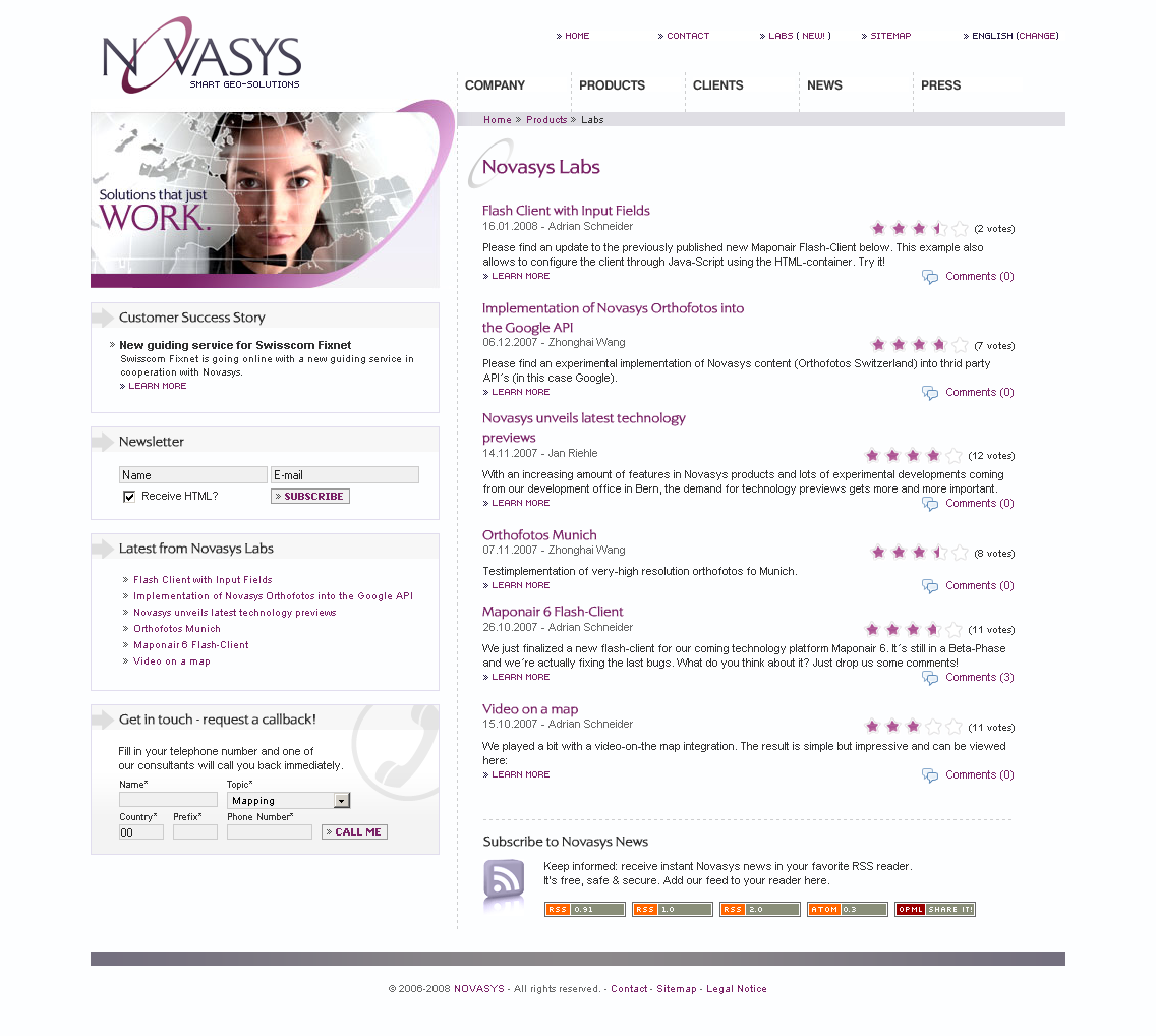 For highly interested visitors and integrators of Novasys' products and services, who need to be informed about any news and updates, an RSS feed has been additionally implemented. By adding the feed to a web browser or feedreader, all news are automatically retrieved from the web site. A user is then able to selectively read only the posts of interest.