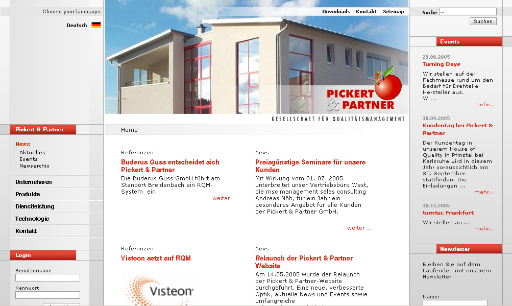 Die Firma Pickert & Partner GmbH aus Pfinztal, ihres Zeichens Softwarehaus für Qualitätsmanagement, erhielt eine vollständig erneuerte Internetpräsenz. Kernstück ist ein umfassendes Redaktionssystem (so genanntes Content Management System), mit welchem die Mitarbeiter des Unternehmens Publikationen frei erstellen und verwalten können. Neben der Veröffentlichung von multilingualen Inhalten wird es Pickert & Partner nun möglich sein, Unternehmensnachrichten in einem umfassenden Newsletter-System zu versenden und zu überwachen.